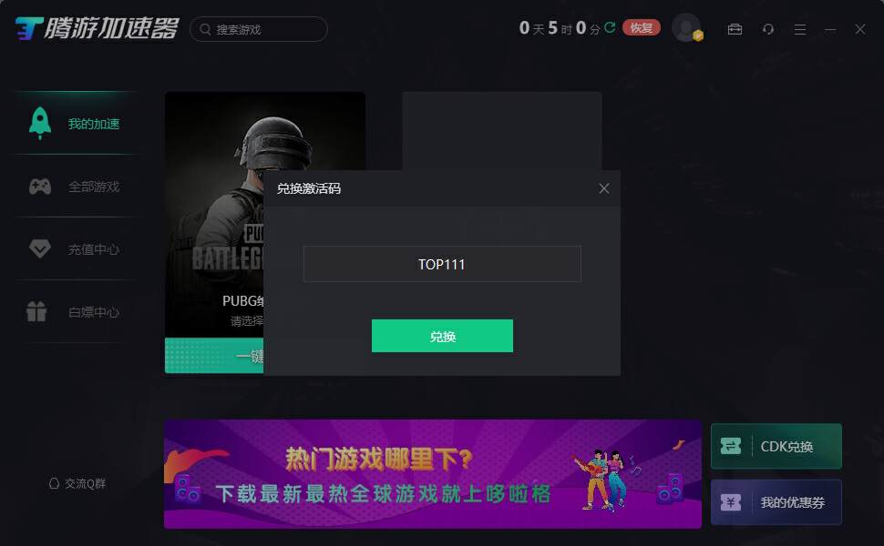 登录腾游加速器,,登录后点击右下角CDK兑换